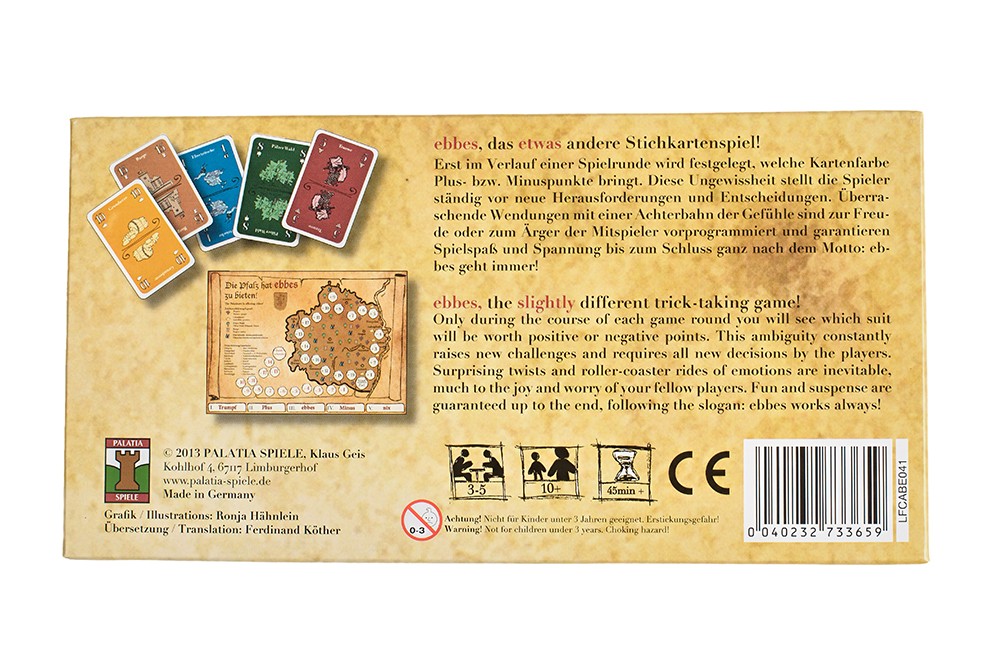 ebbes ist ein besonders faszinierendes Stichkartenspiel, bei dem erst im Verlauf einer Spielrunde festgelegt wird, welche der Kartenfarben Plus- oder Minuspunkte bringen. Diese Ungewissheit stellt die Spieler ständig vor neue Herausforderungen und Entscheidungen. Überraschende Wendungen zur Freude oder zum Ärger der Mitspieler sind vorprogrammiert und garantieren Spielspaß und Spannung bis zum Schluss, ganz nach dem Motto: