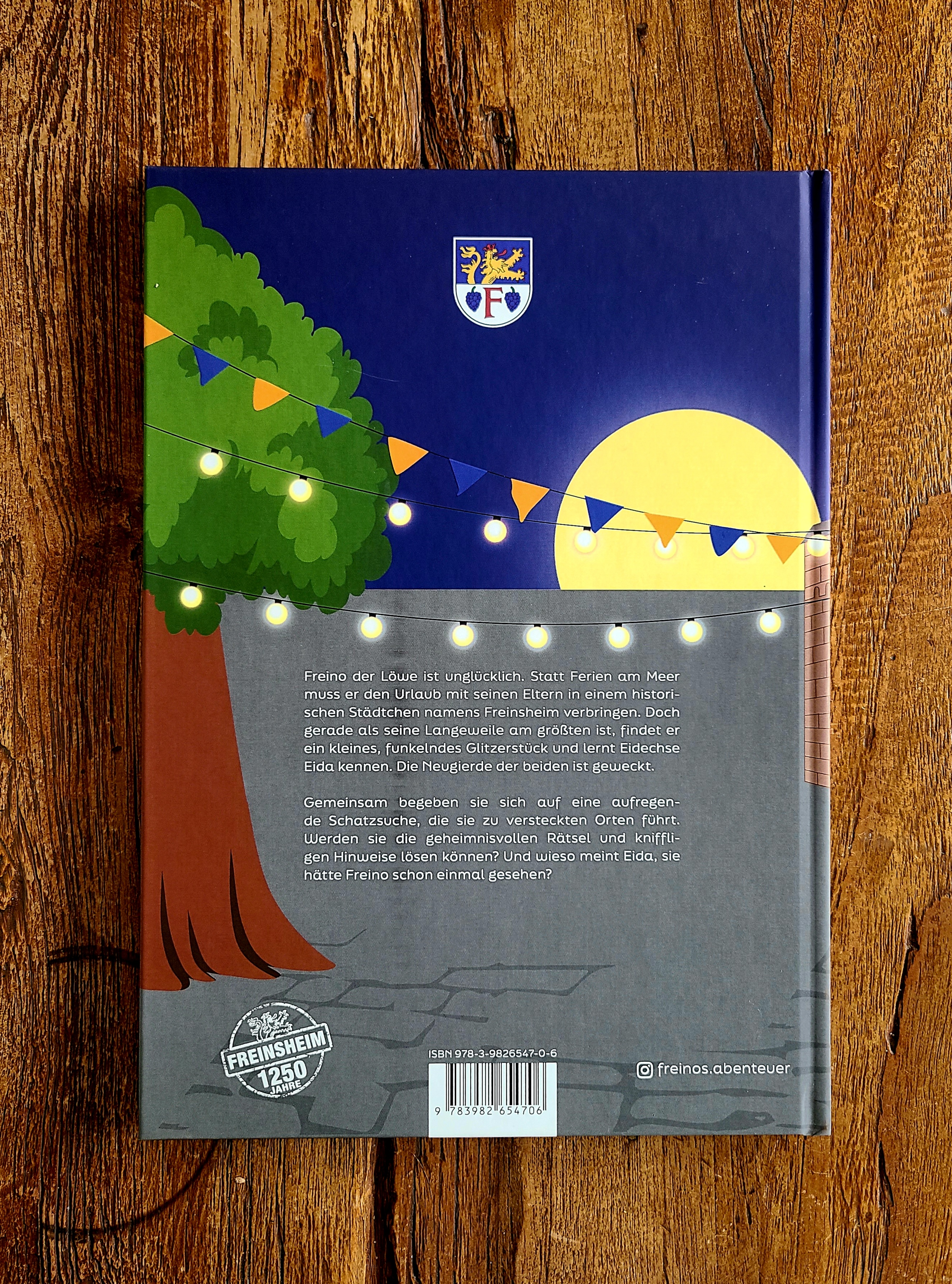 Freino der Löwe ist unglücklich. Statt Ferien am Meer muss er den Urlaub mit seinen Eltern in einem historischen Städtchen namens Freinsheim verbringen. Doch gerade als seine Langeweile am größten ist, findet er ein kleines, funkelndes Glitzerstück und lernt Eidechse Eida kennen. Die Neugierde der beiden ist geweckt. Gemeinsam begeben sie sich auf eine aufregende Schatzsuche, die sie zu versteckten Orten führt. Werden sie die geheimnisvollen Rätsel und kniffligen Hinweise lösen können? Und wieso meint Eida, sie hätte Freino schon einmal gesehen?Ein spannendes Kinderbuch mit tollen Illustrationen für Kinder von 5–10 Jahren.Eine Kombination aus fiktionaler Geschichte und interessanten Sachinfos,bei denen auch Erwachsene noch etwas über Freinsheim lernen können.Im Selbstverlag veröffentlicht von den Freinsheimerinnen:Manuela Giel (Text) & Julia Wißmann (Illustration, Layout/Satz)– A4 (210 x 297 mm– Hardcover– Umschlagveredelung: soft touch + Partielle 3D UV Lackierung– Fadenheftung– 40 Seiten– 1. Auflage August 2024– ISBN 978-3-9826547-0-6