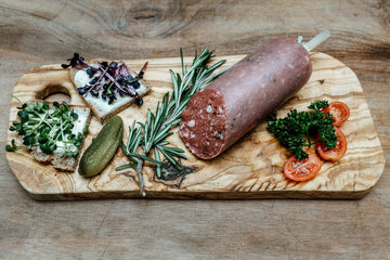 Durch die Verwendung von Wildfleisch garantieren wir Ihnen nicht nur höchsten Geschmack, sondern auch höchste Qualität und Nachhaltigkeit. Das Fleisch stammt ausschließlich aus der Region. Unsere Wildschwein-Reh-Hirsch Salami wird von Hand gefertigt und durch ein ausgiebiges Reifeverfahren entfaltet sie ihr volles Aroma.