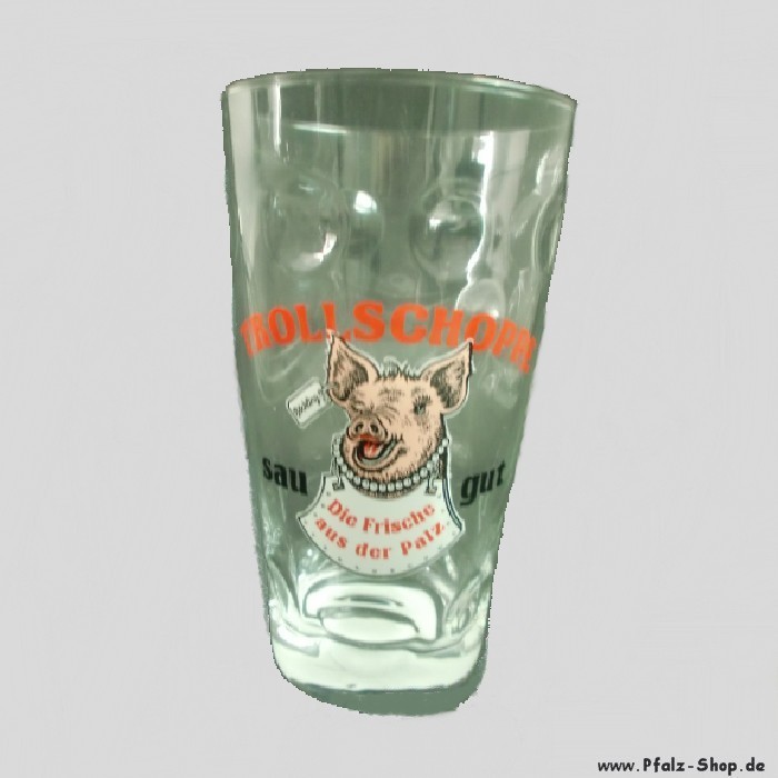Dem Glas ist der Pfälzer Spruch „De Dorscht, der macht erscht richtig Spaß, hoscht so e Pfälzer Dubbeglas!“ gewidmet." Quelle:Wikipedia